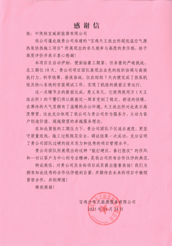 近日,中陕核宜威公司收到一封来自客户—宝鸡分布式能源有限公司的书面表扬信。信中对宜威公司承建的“宝鸡天王镇派出所超低温空气源热泵供暖施工项目”的全周期施工成果给予高度肯定和赞赏,特别表扬了项目团队在执行过程中的专业素养和工作作风。 在项目开工前,宜威公司高度重视施工质量,工程维保部迅速组织精干力量成立项目部。施工期间,项目部始终坚持以客户需求为核心,面对施工时间紧和技术要求高的情况,严格制定了精细化施工计划,...