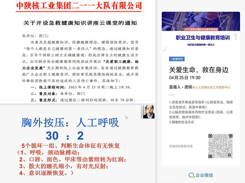 为普及急救健康知识,传播健康理念,增强预防意识,倡导“每个人都是自己健康的第一责任人”的理念,4月25日,二一一大队有限公司联合安全健康教育网陕西站开展以“关爱职工健康、助力企业发展”为主题的线上公益宣教...