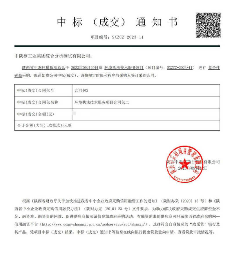 金秋时节,收获满仓。9月22日,中陕核生态环境有限公司权属子公司中陕核工业集团综合分析测试有限公司凭借卓越的技术实力、优秀的服务质量和创新的服务理念,成功中标陕西省生态环境执法总队环境执法技术服务项目。 ...