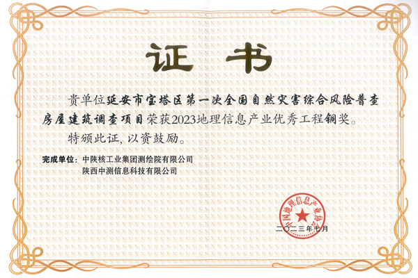 在中国地理信息产业协会举办的2023地理信息产业优秀工程评选结果公示名单中,中陕核工业集团二二四大队有限公司测绘院申报的“延安市宝塔区第一次全国自然灾害综合风险普查房屋建筑调查项目”荣获“2023中国地理信息...