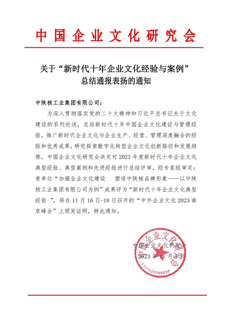 近日,在南京举办的第二十届中外企业文化峰会圆满落幕。由集团党委宣传部撰写报送的中陕核集团企业文化案例《加强企业文化建设 塑造中陕核品牌形象——以中陕核工业集团有限公司为例》经过组委会数位专家的多轮评选,...