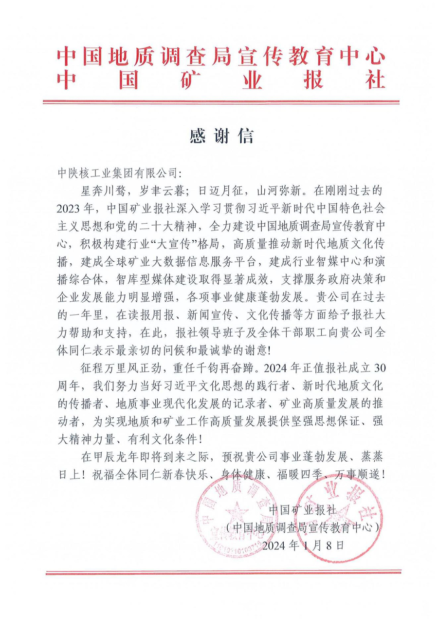 近日,中陕核集团收到中国矿业报社发来的感谢信,衷心感谢中陕核集团过去一年在认真组织采写新闻稿件、不断增强文化传播影响力、支持报社高质量发展等方面做出的积极贡献,并向中陕核广大干部职工表达新春祝福。 202...