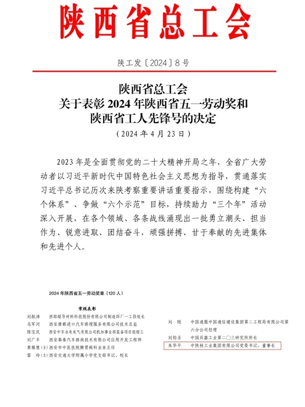 近日,陕西省总工会发布《关于表彰 2024 年陕西省五一劳动奖和陕西省工人先锋号的决定》,集团公司党委书记、董事长朱华平被授予“陕西省五一劳动奖章”荣誉称号。 朱华平同志在34年的工作历程中,始终以一名合格共...