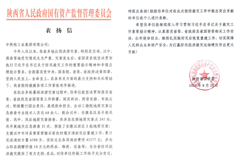 8月21日,中陕核集团收到省国资委表扬信,对中陕核集团在严峻复杂的防汛形势下,积极贯彻落实省委、省政府及省国资委工作部署,中陕核集团党委第一时间进行抗洪救灾动员工作,充分发挥中陕核集团在装备、技术、人员等...